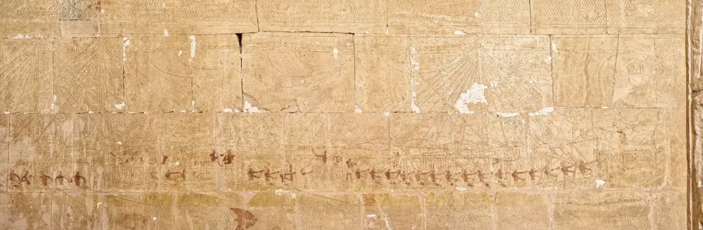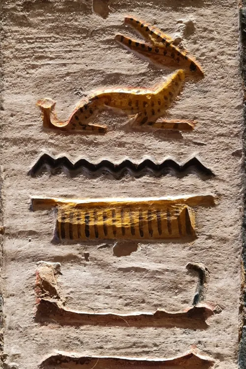 Chaque centimètre des murs est couvert de textes hiéroglyphiques. Ici, un détail magnifiquement préservé révèle un lièvre bondissant, un serpent ondulant et un pain strié, peints avec des couleurs éclatantes. Ces symboles composaient les formules sacrées destinées à guider le pharaon dans son voyage vers l’au-delà.