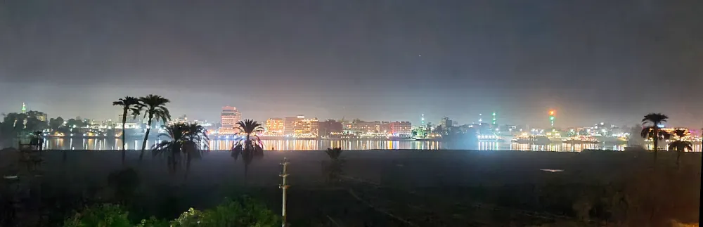 Il est 18h, il fait déjà nuit. L’horizon change, les palmeraies liassent présager -enfin- l’arrivée sur les rives fertiles du Nil. Paisible, il contraste avec la frénésie et la cohue de la route à l’approche de Louxor. Les conducteurs n’allument leurs feux que lorsqu’ils sont amenés à rencontrer un véhicule en face. On double à droite, puis à gauche, ça freine et redémarre en trombe, on fait le concours du nombre de personnes par mobylette… On est bien contents de ne pas avoir le volant entre les mains !