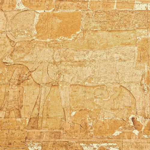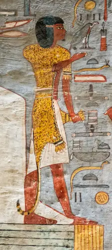 Une fresque remarquablement préservée montre un prêtre sem, vêtu d’une tunique en peau de félin, officiant pour le roi défunt. Ce costume, réservé aux rituels funéraires les plus sacrés, symbolisait la puissance magique du prêtre, garantissant la renaissance du pharaon dans l’au-delà. Les couleurs vives – rouge du corps, jaune tacheté de la peau animale, noir des cheveux – conservent une intensité étonnante malgré les millénaires.
