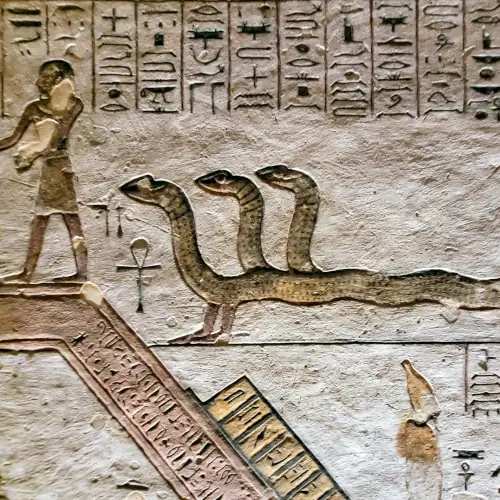 Parmi les scènes qui m’ont le plus impressionnée, figure un serpent à trois têtes, gardien des enfers. Tirée du Livre des Cavernes, cette fresque illustre les épreuves que le roi devait surmonter pour renaître auprès du dieu Rê. Les Égyptiens avaient une imagination foisonnante à propos de la mort et à l’éternité !