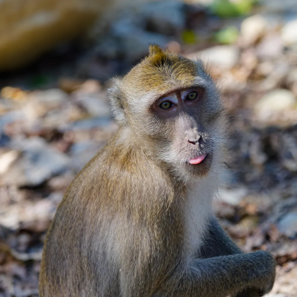 Un gros mâle Macaque crabier traverse ensuite le sentier en utilisant un bambou comme passerelle. King Kong nous fait signe de détourner le regard. Il défend son groupe, et mieux vaut ne pas le provoquer.