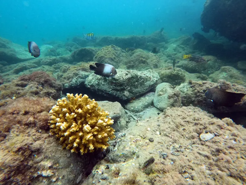 Mon cerveau me joue des tours : dans 50 cm d’eau trouble, tout devient potentiellement hostile. Mais une jeune Carangue dorée nous escorte en snorkeling, mini-garde du corps aquatique.
